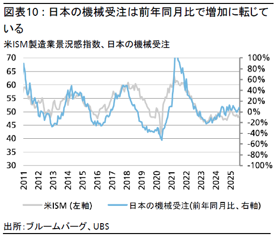 米サプライマネジメント協会(ISM)の製造業景況感指数は依然として50を下回る水準が続いているものの、より広範囲の企業を対象とした購買担当者景気指数(PMI)は先行して改善傾向にある。日本の機械受注も前年同月比で増加に転じており、日本企業は特に米国受注が堅調と述べており、改善はまだ緩やかだが、着実に改善の兆候が表れている(図表10参照)。