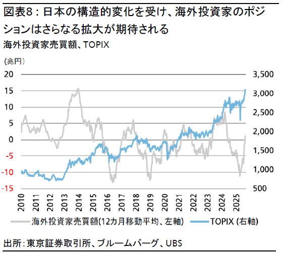 直近数週間は海外投資家の資金流入が一服しているが、これは2024年下期以降、大幅に売り越していた日本株のポジションを中立的な水準に戻したにすぎない。