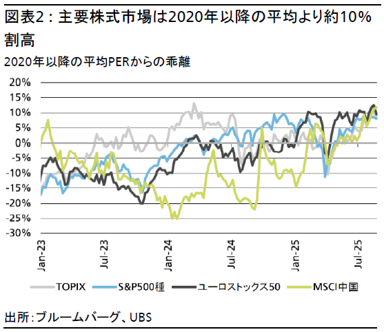 例えば、S&P500種株価指数のPERの22.5倍と比較すると、TOPIXのPERは29%割安な水準にあり、2020年以降の平均と同水準である。また、米国、欧州、日本、中国といった主要株式市場のPERは、いずれも2020年以降平均に対して約10%割高な水準で取引されており、日本株だけが過去と比較して特別に割高というわけではない(図表2参照)。