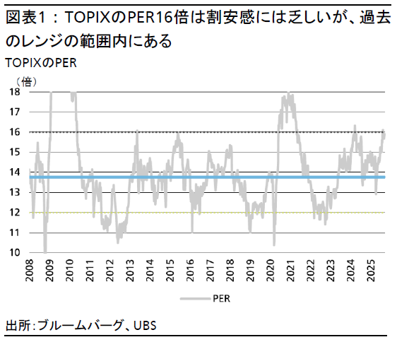 東証株価指数(TOPIX)の株価収益率(PER)は16.0倍と、過去の12-16倍というレンジの上限にあり割安感には乏しいものの、ROE拡大の可能性を織り込めば、このバリュエーションは許容されると考える。また、世界的にバリュエーションが上昇傾向にある中で、日本株の相対バリュエーションに割高感はない(図表1参照)。