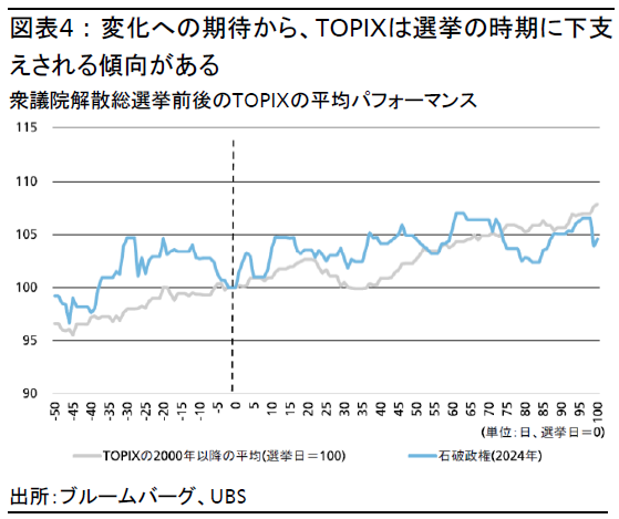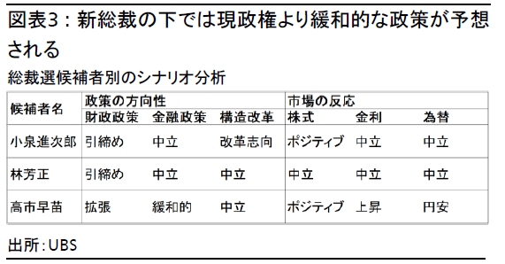 本稿執筆時点で3名が有力候補と言われている。44歳で改革志向である小泉進次郎農水相、または成長重視の財政政策とハト派的な金融政策を掲げる高市早苗前経済安保相が選出されれば株式市場はポジティブに反応するだろう。林芳正官房長官は現政権の政策を維持するとみられ、株式市場への影響は中立的となることが考えられる(図表3参照)。