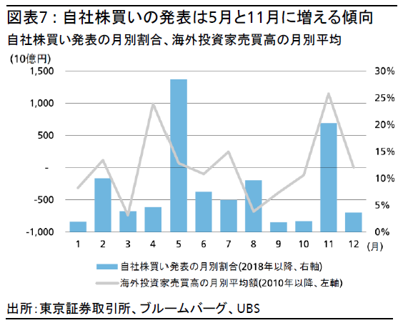 9月は世界的に株価が弱含みやすい月とされるが、9月を通過すれば、10-12月期は日本企業の7-9月期の決算発表で自社株買いの加速が期待され、株価は下支えされる見通しだ。11月は5月に次ぎ自社株買い発表が多い月である(図表7参照)。