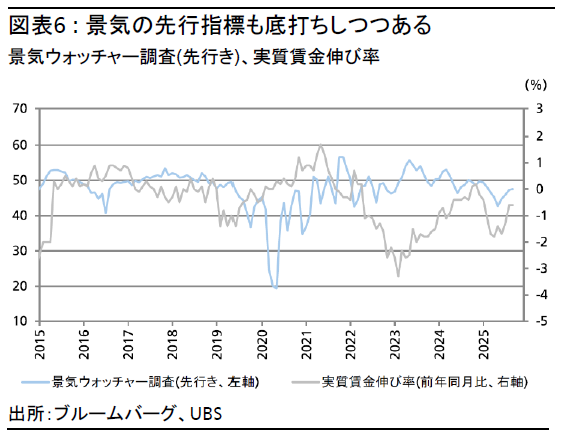 加えて、景気の先行指標である景気ウォッチャー調査も底打ちし始め、国内のセンチメントは反転しつつある(図表6参照)。実質賃金は依然としてマイナス圏にあるものの、足元では下げ止まりつつあり、来年の消費回復に対しても前向きな見通しが持てる状況だ。