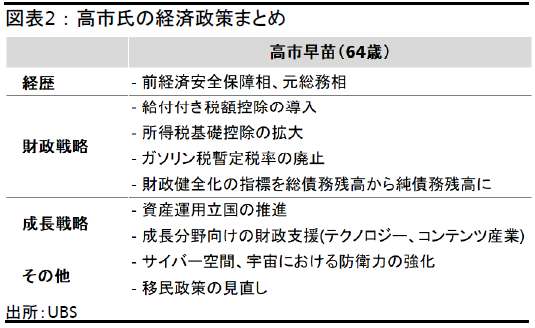 中長期的には、国防費の大幅増額や、給付付き税額控除の導入を主張する可能性がある。