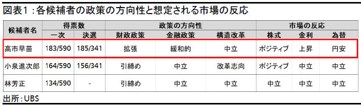 10月4日、高市早苗氏が大方の予想に反して自民党総裁に選出された。10月中旬にも首相に指名される見通しであり、日本初の女性首相となる。