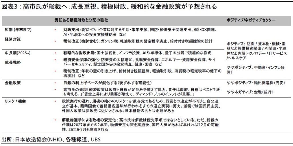 高市早苗新総裁は、減税や景気刺激策、特に先端技術や国家安全保障に関連する分野への投資に注力すると予想している。これらの政策が企業業績を下支えし、来年にかけて生産性の向上を促すだろう。