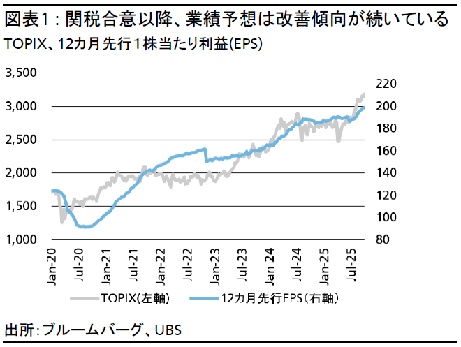 - 主なポジティブ材料としては、次期政権ではより緩和的な政策が予想されることや、企業業績のコンセンサス予想が想定より早く底打ちしてきたこと、2026年に向けた自己資本利益率(ROE)の上昇によるバリュエーション拡大期待などが挙げられる。