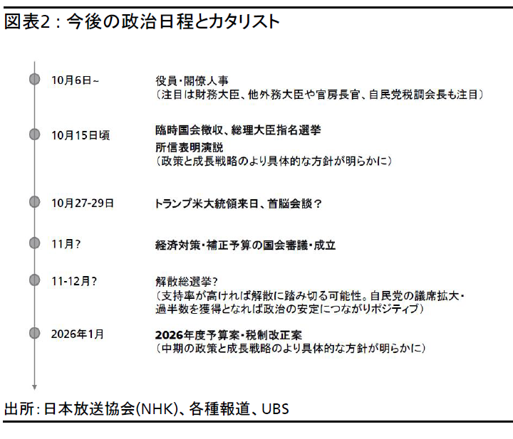 - 高市氏の支持率が上昇すれば、衆議院の解散・総選挙が行われる可能性がある。これにより少数与党体制が解消されれば、市場はポジティブ材料と受け止めるだろう。
