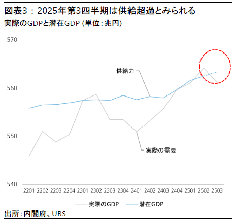 しかし、2025年第2四半期にはGDP比0.3%の需要超過となったものの、第3四半期のGDPは前期比0.4%減(年率1.8%減)となり、日本経済はGDP比0.5%程度の供給超過に戻ったと考える。仮に財政需要が0.5-1%増加しても、需要超過はゼロ近傍にとどまり、インフレ加速への懸念が生じるとは考えにくい。