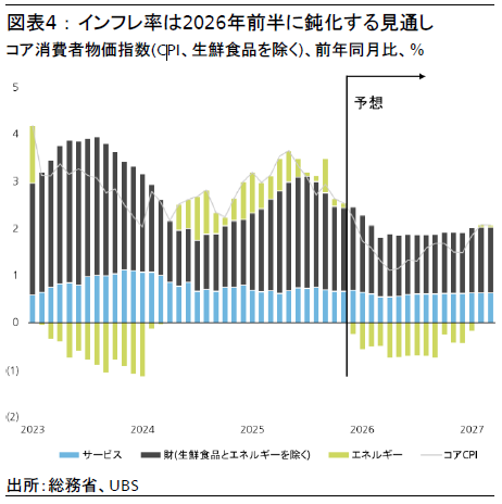 輸入物価は過去1年で軟化しており、2026年前半にはインフレ率も鈍化する見通しである。加えて、今回の経済対策にはガソリン税減税や電気・ガス代補助など物価高対策も含まれており、我々の基本シナリオではインフレの加速は予想していない。