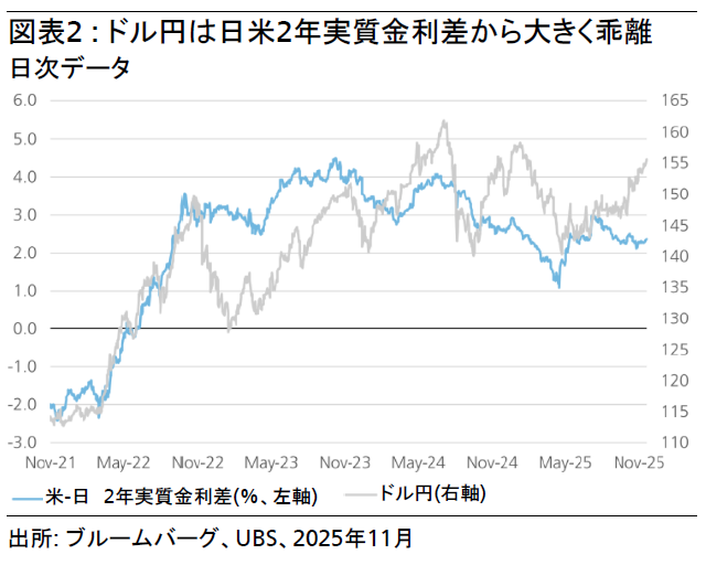 これら短期的な要因が一巡した後、2026年第2四半期以降には、ドル円の下落ペースが鈍化すると見込む。この時点で、FRBは3.25-3.50%でターミナルレート(最終到達金利)に達しており、中立的な政策スタンスへ転換すると考える。同時に、FRBによるこれまでの金融緩和や、中間選挙を前に「1つの大きく美しい法案」の財政刺激策の効果が表れることにより、米国経済のモメンタムも好転し始める可能性がある。しかし、2026年後半に米国経済が安定しても、ドル円は2026年12月までに146円へ向けて下落すると予想する。日銀は2026年第4四半期に追加利上げを実施し、政策金利は1%となる見通しである。日米の短期金利差は、現在の約3%から2-2.5%へと縮小が続き、ドル円と2年実質金利差の大きな乖離は狭まると予想する(図表2参照)。