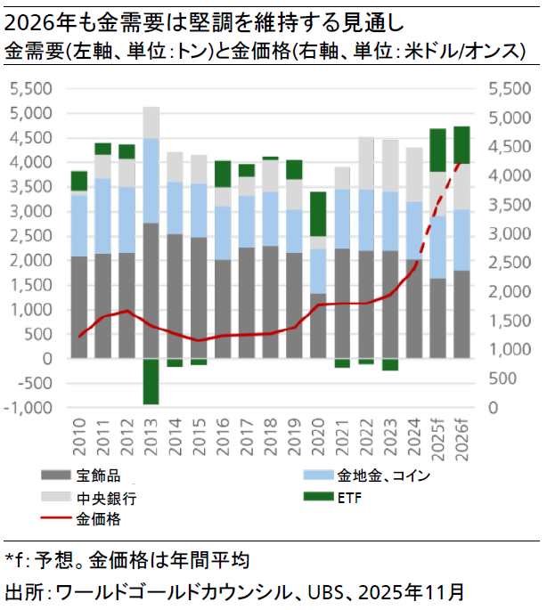 金需要は2026年、FRBによる利下げサイクル継続見通し、実質金利の低下、地政学的不透明感の持続、中間選挙を巡るノイズ、財政懸念の高まりなどから、さらに高まると予想する。