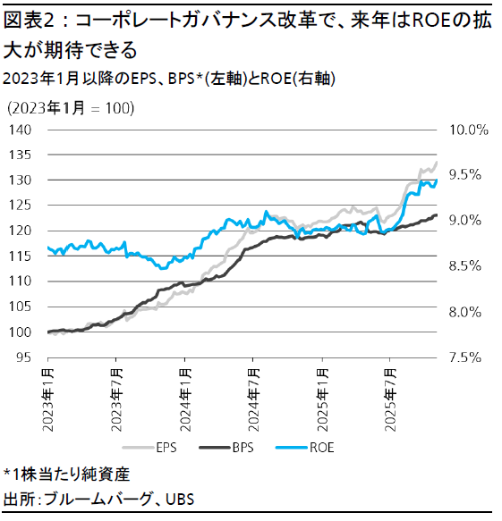 2025年度の本決算では、いよいよ自己資本利益率(ROE)の拡大が期待できる(図表2)。自社株買いの加速、親子上場の解消、キャピタルアロケーション(資本配分)の変更、不採算事業のリストラなどの取り組みの具体的な効果が、数字として出始めると考える。構造的なROEの上昇により、日本株のバリュエーションレンジが大きく押し上がることが期待できる。