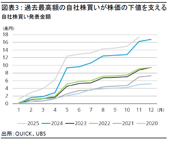株式市場の需給面では、企業の自社株買いが株価の下値をサポートすると考える。日本企業の自社株買いは年初来で17.3兆円と過去最高を更新している(図表3)。一方、自社株買い実施額は13兆円程度にとどまっている。直近の急激な株高を受けて企業は一時的に自社株買いペースを鈍化させていると推察される。逆に、株価が調整すれば自社株買い待機資金が株式市場に流入し、下値をサポートすると考えられる。