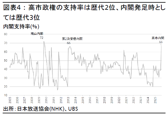 高市政権の支持率は歴代2位、内閣発足時としては歴代3位の高水準である(図表4)。高市首相の強いリーダーシップと政策実現には国民の支持が重要となる。政権発足後の調査によれば、国民にとって最も優先順位の高い事項は物価高であり、行き過ぎた円安とそれに伴うインフレ率の上昇は支持率低下、ひいては政策実行確度の低下につながりかねない。
