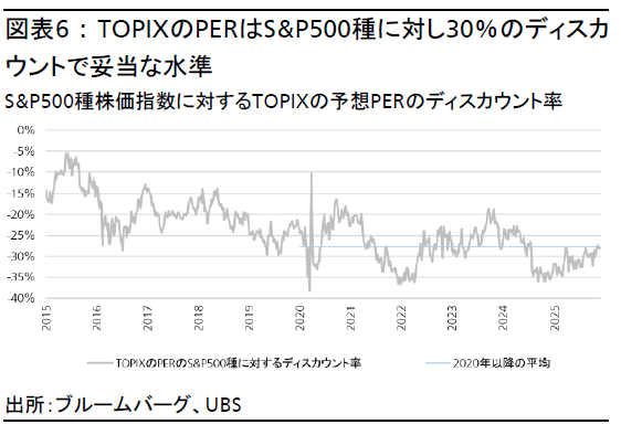 直近の株価下落により、東証株価指数(TOPIX)の株価収益率(PER)は15.9倍と、再び16倍以下へ低下した。過去からのレンジである12-16倍の上限に位置しており、必ずしも絶対値で割安とは言い難いが、相対的に見て妥当であると考える。S&P500種株価指数に対するPERのディスカウント率は30%と、過去5年の平均並みである。