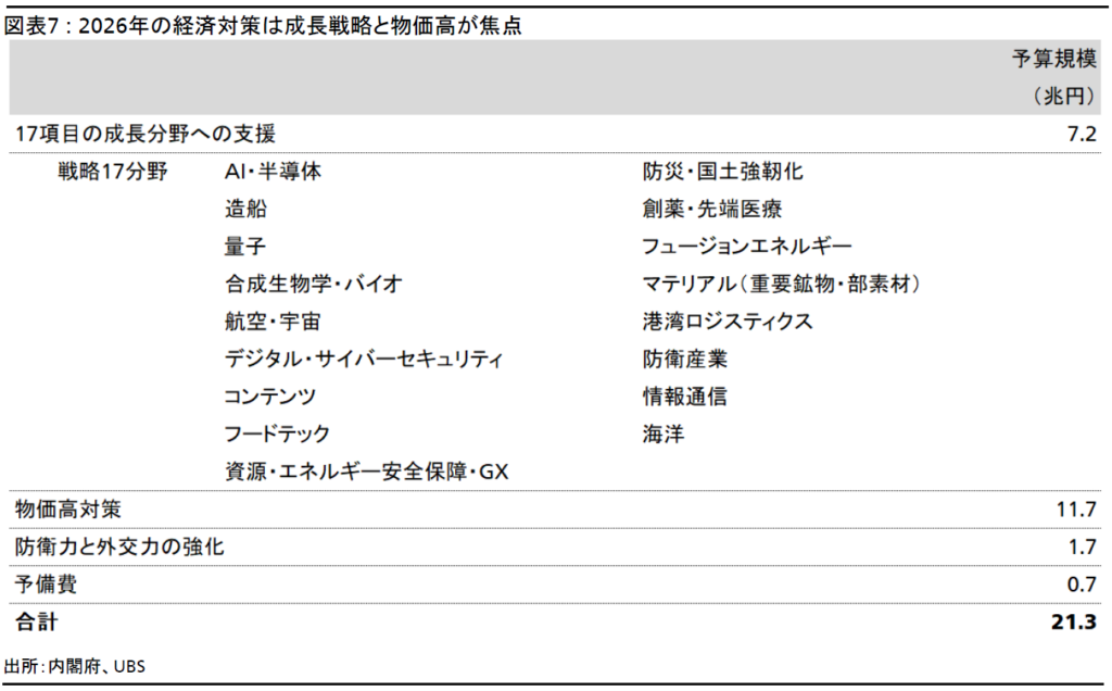 11月21日に発表された2026年の経済対策のための財政支出21.3兆円は、前政権時の規模を上回る。これには、高市政権が成長分野とした17項目の重点分野に対する政策支援が含まれ、同分野の投資拡大が期待できる(図表7)。