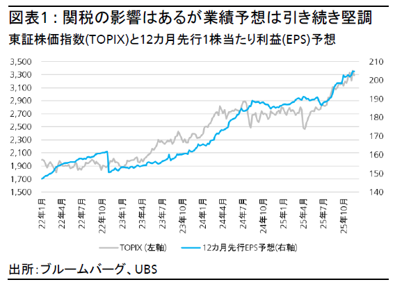 2025年7-9月期(第2四半期)における日本企業の決算は事前想定を上回り、当期利益は前年同期比で35%増益だった。一過性要因を除く営業利益ベースでは2%増益と、4-6月期の11%減益から急激に回復した。コンセンサス業績予想は決算後も上方修正が続いており、株価上昇を牽引すると考える(図表1)。