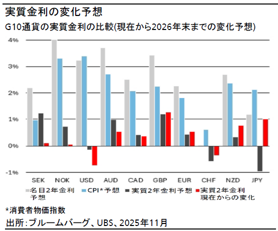- 2026年の通貨市場は、各国中央銀行の政策変更、インフレ動向、実質金利の順位に影響されると考える。主要な中央銀行の多くは2026年半ばまでに金融緩和サイクルを終了し、G10通貨国間でインフレの状況に差が出るだろう。