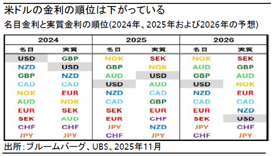 G10通貨国の名目金利と実質金利の順位は、米ドルが今年軟化した理由と、CIOが2026年に下落を予想する根拠を示唆している。インフレ率上昇により、米国の実質金利は2026年に下から3番目となり、日本とスイスのみが米国を下回る見通しである。