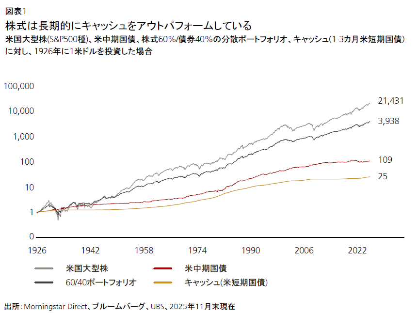 長期的に見て、キャッシュが十分なリターン確保につながっているとは言い難い。1926年に米国大型株(S&P500種株価指数)に1米ドルを投資した場合、2025年11月には21,431米ドルまで増えていることになるが、株式60%/債券40%の分散ポートフォリオでは3,938米ドル、キャッシュ(1-3カ月米短期国債)ではわずか25米ドルにしかならない。