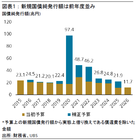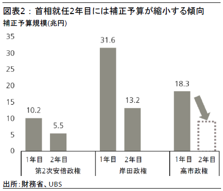 日本の財政状況を考える際には、毎年編成される補正予算も考慮する必要がある。だが、2026年度の補正予算の規模は2025年度よりも縮小する公算が大きい。就任から間もない首相は、1年目に目玉政策を迅速に実行して国民にアピールするため、大型の補正予算を組む傾向がある。例えば、第2次安倍晋三政権では2012年度補正予算が10.2兆円であったのに対し、2013年度は5.5兆円に縮小した。岸田文雄政権では2022年度補正予算が31.6兆円で、2023年度は13.2兆円に縮小した。よって高市政権でも、2026年度補正予算は2025年度よりも抑制され、財政政策は2026年度に健全化路線へ戻ると考える。