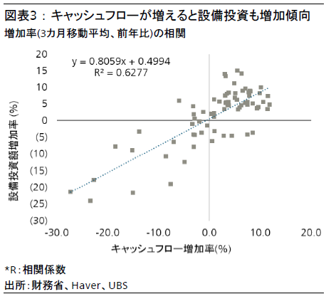 設備投資促進のための税制措置では、企業は設備投資の総額を一括で償却するか、設備投資額の7%について税額控除を受けることができ、いずれの方法も企業のキャッシュフロー増加につながる。企業のキャッシュフローが1%増加すると、2四半期後に設備投資が平均0.8%増加するという相関があるため、この措置によって2026年の設備投資押し上げ効果が期待できる。
