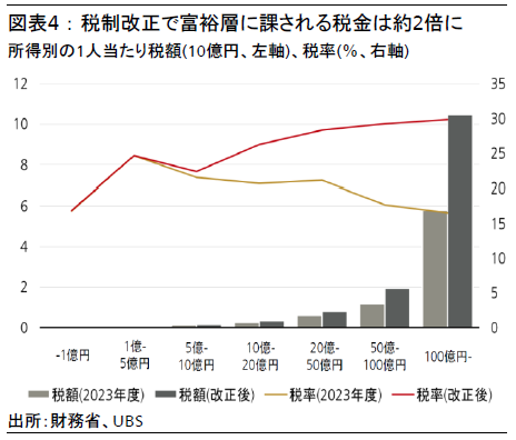 一方で、富裕層に対する税率の引き上げは懸念材料である。これまで、所得が10億円を超える場合の実効税率は17-21%であったが、2025年からは3億3,000万円を控除後の課税所得に22.5%の税率が課されている。更に最新の税制改正では、2027年から1億6,500万円を控除後の課税所得に30%が課され、富裕層に対する実効税率は約30%まで上昇すると予想する。これにより税収は約3,000億円増加し、各種減税の財源となるが、富裕層が日本を離れることにより、資産が大幅に海外へ流出するリスクもある。