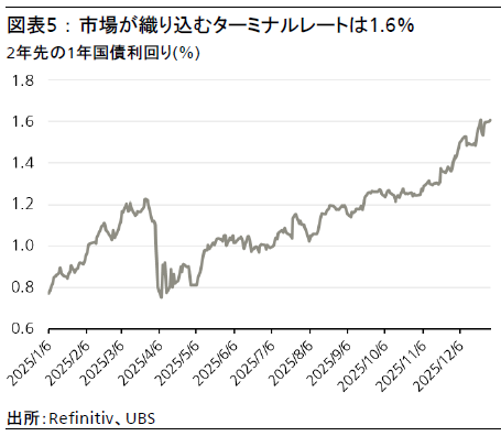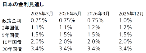 高市首相就任以降、経済対策、日銀の利上げ、税制改正、2026年度予算編成など財政・金融イベントが相次ぎ、ターミナルレート(最終到達金利)が引き上げられるとの予想から金利が急速に上昇している。その結果、10年国債利回りは2025年12月に2%を超えた。しかし、これらのイベントを通過し、インフレ率は2026年前半に低下する見通しのため、ターミナルレートは現在の1.5%超から1.25%へ低下すると考える。よって10年国債利回りは、短期的な変動はあるものの、2026年を通じて2%前後で推移する見通しである。