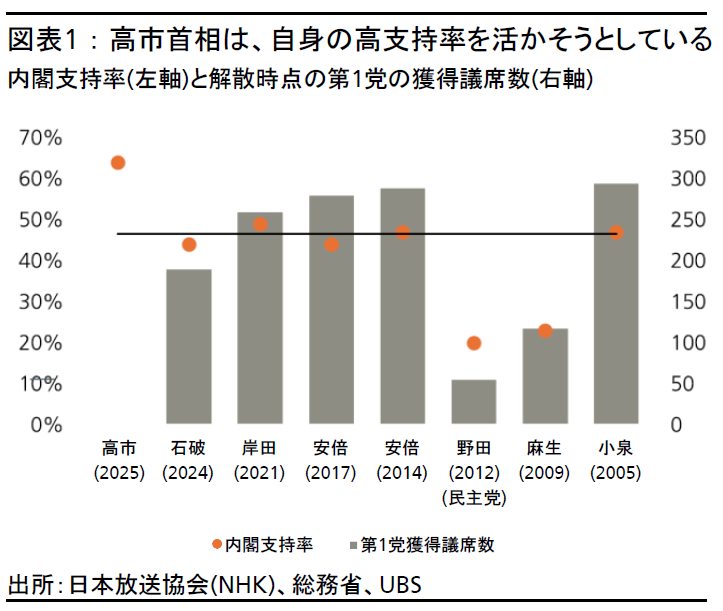 海外投資家は、強いリーダーシップ、明確な政策方針、長期安定政権が見込まれる局面で日本株を買い越す傾向がある。具体的には、小泉純一郎政権(2005年)や安倍晋三政権(2012年・2014年)時が挙げられる。こうした局面では、衆議院解散日から選挙後12週間でTOPIXは平均26%上昇した。第1党が過半数を確保した場合は同期間でTOPIXが18%上昇したのに対し、過半数を割った場合は4%下落した。