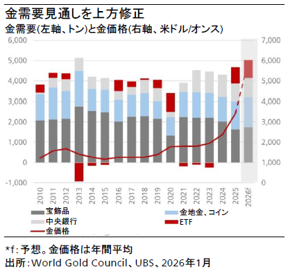 もっとも、短期的には市場のポジションや流動性がファンダメンタルズ(基礎的諸条件)以上に金価格に影響を及ぼすだろう。シカゴ・マーカンタイル取引所(CME)グループが今回の価格変動を受け、ニューヨーク商品取引所(COMEX)の金先物における証拠金要件を6%から8%に引き上げるなど、主要取引所は証拠金要件を引き上げており、レバレッジ縮小や保有コスト増加による調整が発生している。今後数日は1オンス当たり4,500‐4,800米ドルへ調整する展開になるとみており、ファンダメンタルズが再び相場を主導するまでは調整が続くと予想する。CIOでは2026年の金需要予測を上方修正しており、米国の実質金利低下や地政学的リスクの長期化を背景に、中央銀行による活発な購入、上場投資信託(ETF)への流入増加、金地金およびコインの購入増加を予想する。また、CIOでは引き続き金に対する投資判断をAttractive(魅力度が高い)とし、グローバル資産配分に金を組み入れている。
