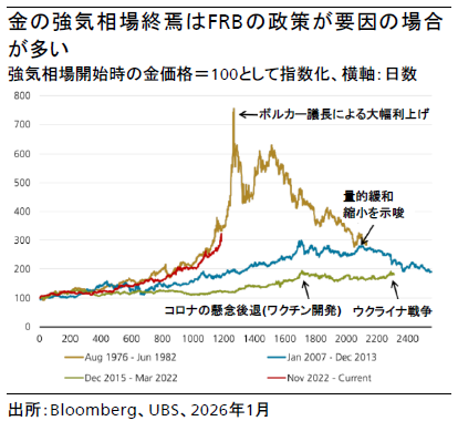 過去の金の強気相場(1970年代、2000年代、2020年以降)を通じ、FRBが米ドルの実質的な価値を維持できるか投資家が疑念を抱く局面で、金価格は上昇する傾向があった。信認が部分的に回復すると価格は下落に転じたが、信認が完全に回復しない限り、強気相場は終わらなかった。