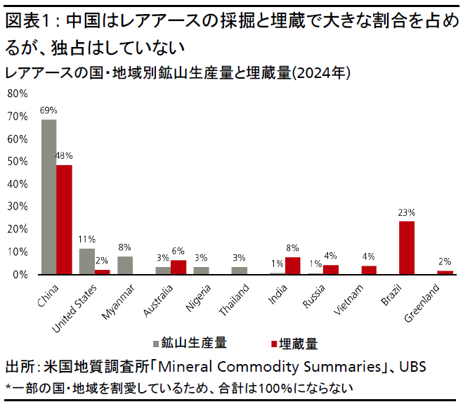 レアアースは地殻中に比較的豊富に存在している。ただし、経済的に採掘できる濃度の鉱床は、他の多くの鉱物資源と比べて少なく、化学的な特性から分離には手間がかかる。米国地質調査所によれば、2024年のレアアース混合酸化物(鉱山からの出荷、中間製品)の生産量は39万トンで、世界の推定埋蔵量は、現在の生産ペースの約230年分に相当する。