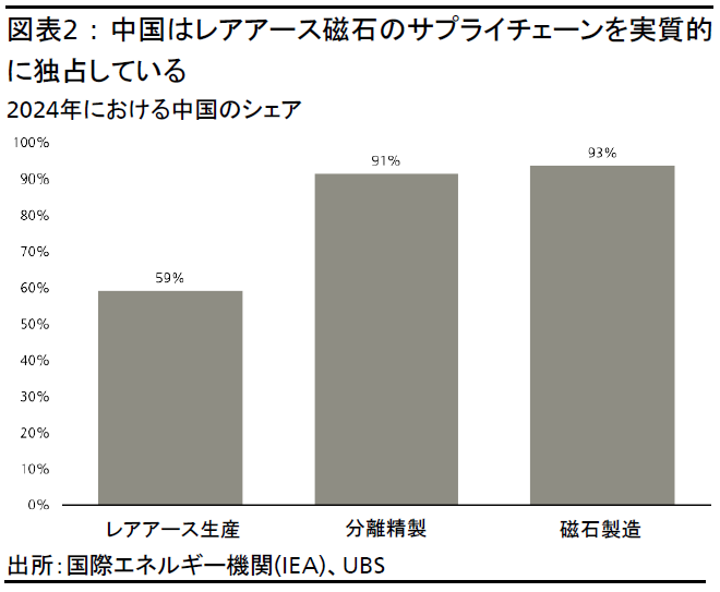 中国はレアアースの最大の生産国だが、独占しているわけではない。中国の鉱山生産量は世界全体の70%近くに達するが、埋蔵量の割合は世界全体の半分に満たない。中国が実質的に独占しているのは、分離精製および磁石の製造である。国際エネルギー機関(IEA)の推計によれば、中国は分離精製に加え、磁石製造でも世界シェアの約90%を占めている。
