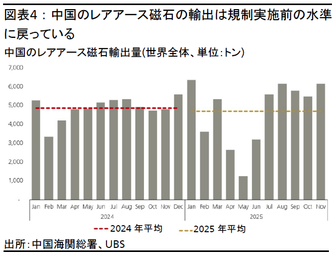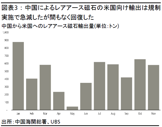 米国政府が2025年4月に相互関税を発表した後、中国は7種類のレアアースの関連品目に対する輸出管理を強化し、サプライチェーンは混乱した。中国の永久磁石の輸出は5月に過去最低水準まで急減、世界全体の輸出量は3月から5月の2カ月間で約75%減少し、米国向け輸出は約90%減少した。その後、取引は急速に回復したが、中国国外ではジスプロシウムやテルビウムなどの価格が1年で3倍に跳ね上がった。