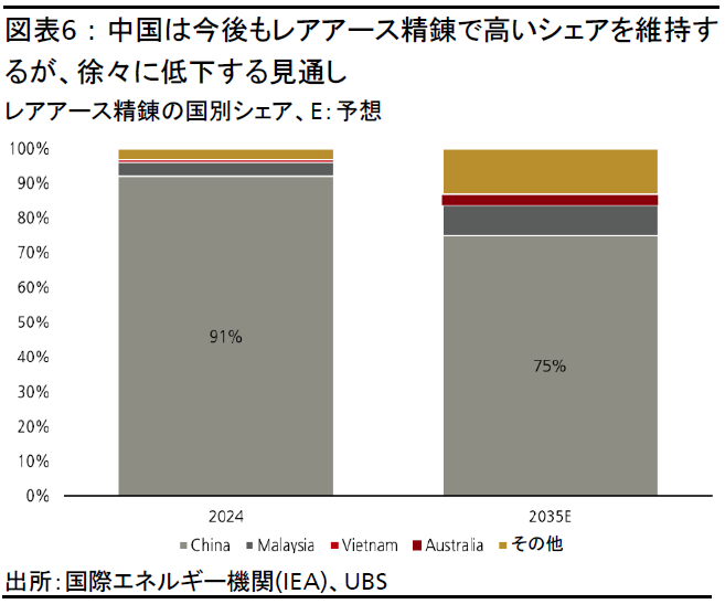 サプライチェーンの多様化が進めば、レアアース磁石の生産に占める中国のシェアは徐々に低下するだろう。米国などで鉱山開発、分離精製、磁石製造能力の拡大が進む一方、鉱山開発には20年以上、精錬工場の稼働にも5年程度かかる場合もあり、完全な自立には長期間を要する。IEAの推計によれば、中国の精錬(分離精製)のシェアは現在の90%超から、2035年には約75%まで低下するとみられ、中国は依然として主導的な地位を維持するものの、市場の支配力はやや低下する見通しだ。