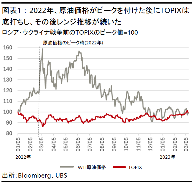 2022年、ロシア・ウクライナ戦争の影響で原油価格は65%上昇し、TOPIXは最大14%下落した。TOPIXは同年2月に原油価格が最初のピークを付けた後底打ちし、その後エネルギー市場が安定するまではレンジ推移が続いた(図表1参照)。