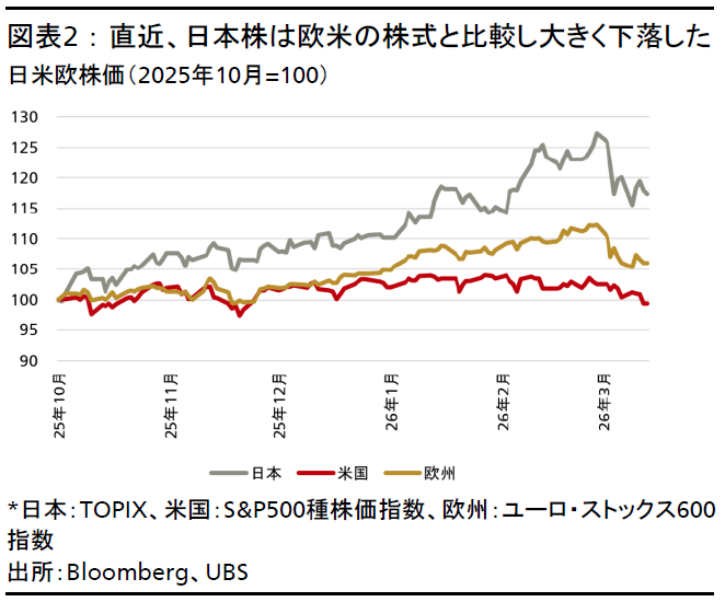 しかし、米国とイランの軍事衝突が起き、原油価格が一時1バレル当たり100米ドルを大きく上回り、日本株は他の株式市場と比較しても大きく売られている。本稿執筆時点で米国のS&P500種株価指数は直近高値から4.3%の下落、欧州株も6.1%の下落にとどまっているのに対し、TOPIXは最大9.1%、日経平均株価は13%下落した(図表2参照)。