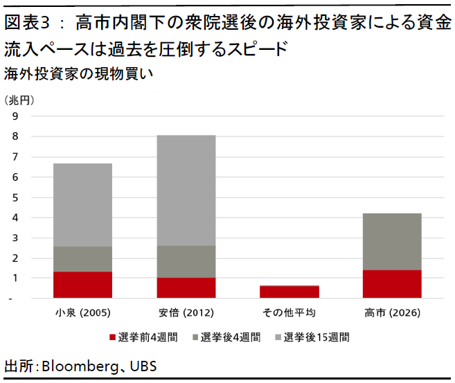 2月8日の衆議院選挙以降、海外投資家の日本株買いが加速し、4週間で現物の買い越し額は4.2兆円に達した。この資金流入ペースは、2005年の小泉純一郎政権、2012年の安倍晋三政権の発足直後を大きく上回っている。両政権時は、構造改革への期待が高まった時期であったが、買い越し額が4.0兆円を上回るのに、小泉政権は17週間、安倍政権は13週を要した(図表3参照)。