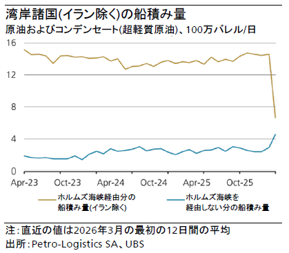 中東における今回の紛争は本稿執筆時点で3週目に入っているが、ホルムズ海峡を経由した原油の輸送は制限された状態が続いている。同海峡を経由する分のタンカーへの積み込みは、イランからの分を除いて停滞している。サウジアラビアやアラブ首長国連邦(UAE)は、パイプラインを通じてペルシャ湾外の港へ原油輸出を迂回する措置を続けており、本稿執筆時点における直近7日間のパイプラインを通じた輸出量は1-2月の平均と比べて日量300万バレル増加している。3月半ばには、紅海に面するサウジアラビアのヤンブー港で、1日としては記録的な量となる610万バレルがタンカーに積み込まれた。なお、ヤンブー港からの2025年における平均原油輸出量は日量170万バレルであり、サウジアラビアの東西を結ぶパイプラインの輸送能力は日量700万バレルである。ただし、こうした輸出にもリスクが残る。ホルムズ海峡の外側に位置するUAEのフジャイラ港で貯蔵施設が再度攻撃された場合や、バブ・エル・マンデブ海峡経由で紅海を抜ける船舶に対し、親イラン武装勢力であるフーシの攻撃が再開した場合には、輸送が混乱する可能性がある。国内の貯蔵能力が限られていることから、ペルシャ湾岸の産油国は3月上旬の時点で、合わせて日量約650万バレルの生産削減を実施したと報じられており、減産幅は数日中に日量1,000万バレルを超える可能性がある。